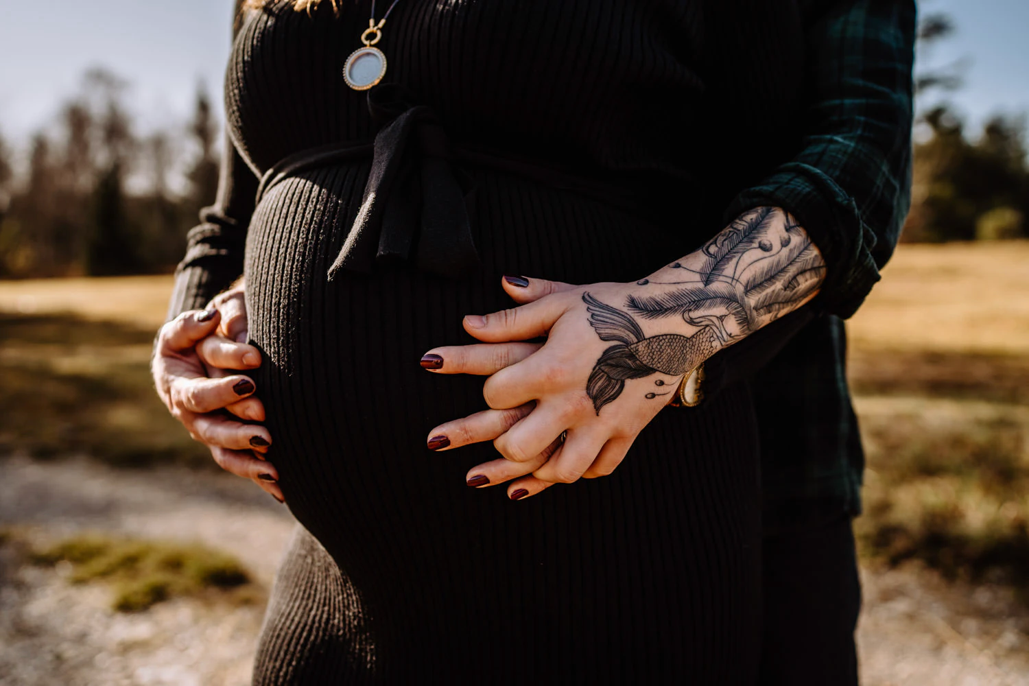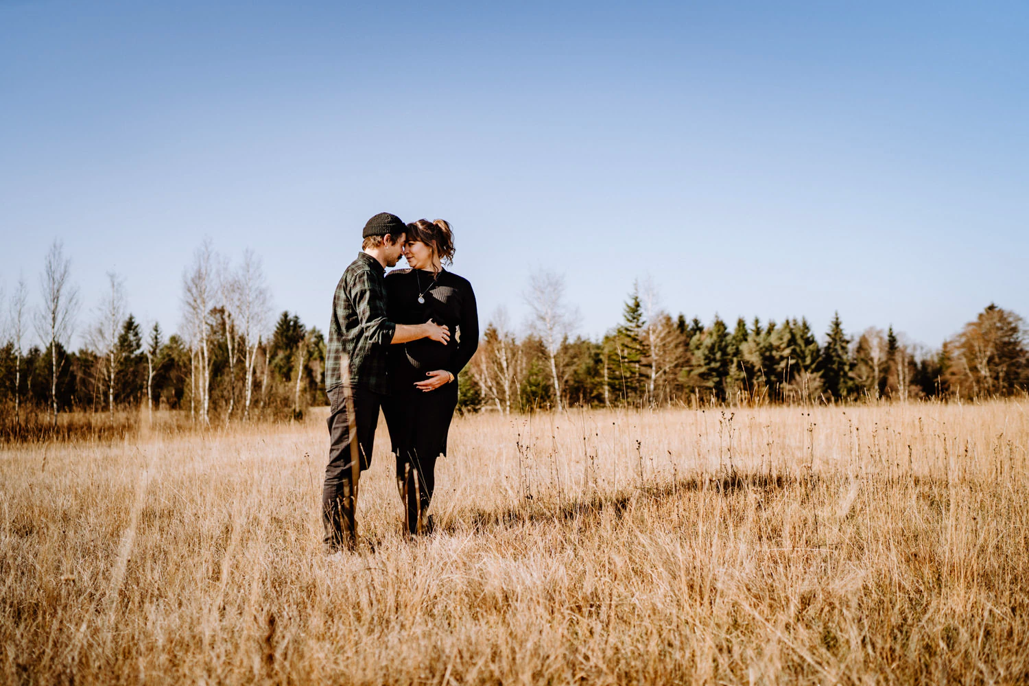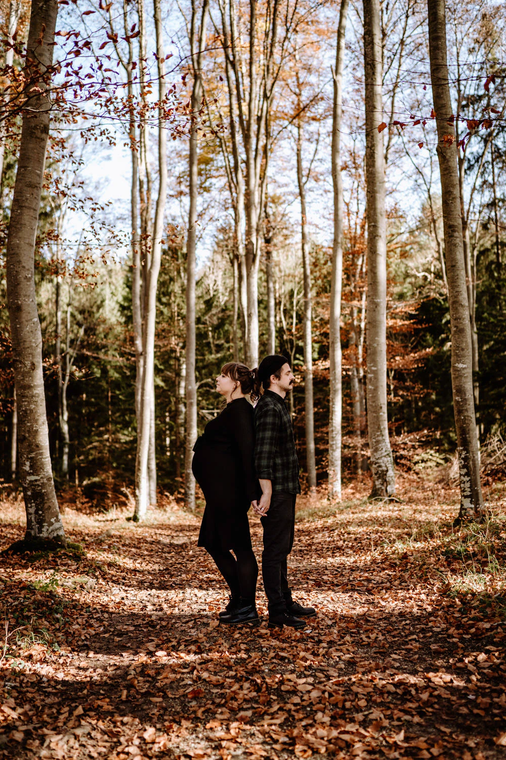 On a beautiful fall morning, we met in the Hardt to take maternity photos in Weilheim. The sun was out, clear and gentle, and it even turned into a really pleasant morning. That warm autumn light made the landscape glow. It’s exactly this kind of mood that makes outdoor maternity photos so special: everything feels soft, natural, and still a little extraordinary.